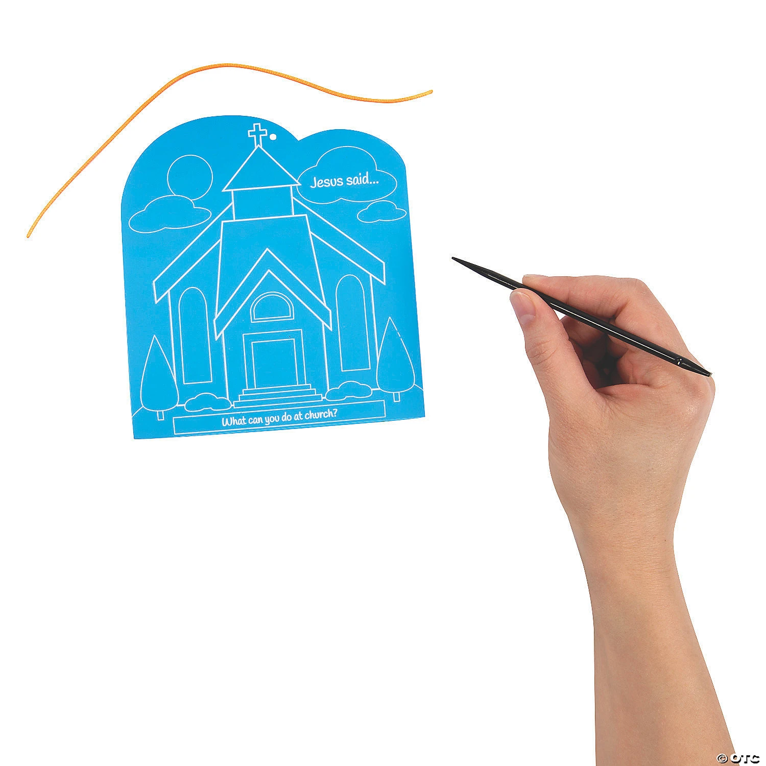 Help kids learn that a church is more than a building with this fun scratch βn reveal. Great as an easy Sunday School project or to help keep kids occupied during church services, the sheet features the image of a church that is scratched away to reveal a vibrant church image, the first line of the Doxology and John 15:12. Includes 24 shapes, 24 scratching tools and satin cords. Cardstock. 5 1/2″ x 6″ Β© OTC