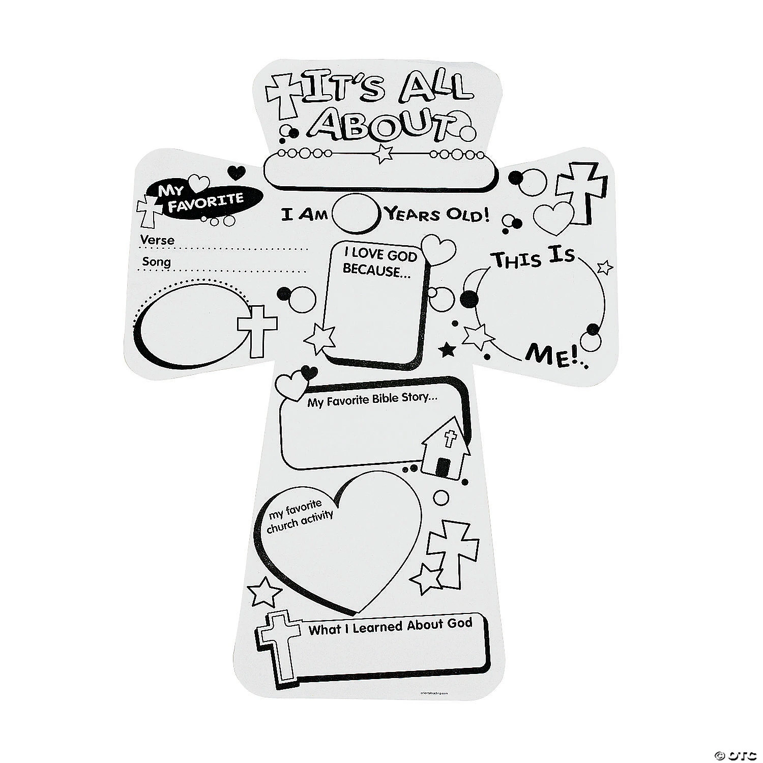 Color Your Own “It’s All About Me” Cutout Crosses. Let your kids introduce themselves during Sunday School or VBS with this great activity – “It’s All About Me”! Kids will love coloring in these giant crosses. At almost 2 ft. tall, there’s a lot of coloring fun to be done! We recommend using crayons, colored pencils, washable markers or permanent markers, sold separately online. Paper. 22 1/4″ x 17″ Β© OTC