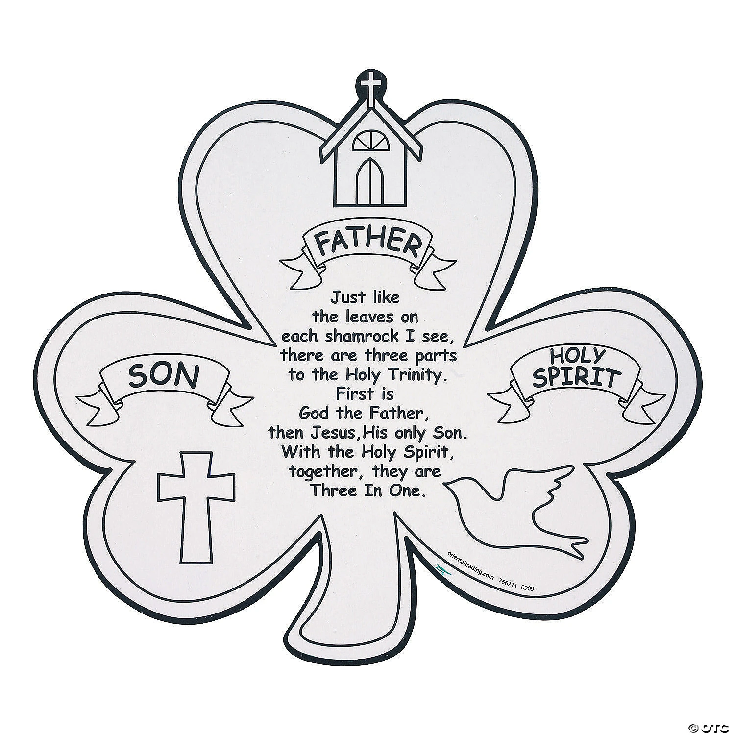 Color Your Own Shamrock Trinity Cutouts. Teach the mystery of the Holy Trinity with this fun project! Color this 10 1/4″ x 11 1/4″ card stock cutout with your own colors while you read this fun poem about the “Father”, “Son” and “Holy Spirit”. Printed with, “Just like the leaves on each shamrock I see, there are three parts to the Holy Trinity. First is God the Father, then Jesus, His only Son. With the Holy Spirit, together, they are Three In One.” We recommend using crayons, colored pencils, washable markers, permanent markers or acrylic paint, sold separately online. Β© OTC