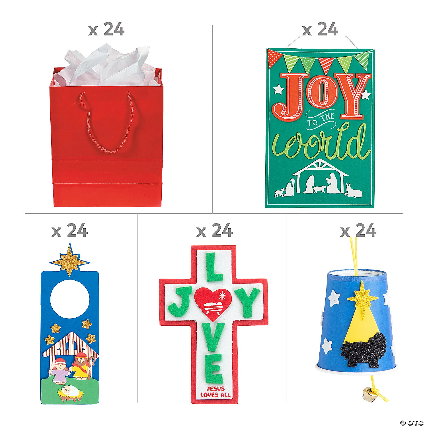 The search is over; your Christmas party favor shopping is complete with the help of this kit! Featuring a variety of faithful crafts ready to be dropped inside the included bags, this craft assortment is just right for church holiday parties and community Christmas events. (120 pcs. per unit) All craft kit pieces are pre-packaged for individual use. Kits include instructions.Includes:β’ 24 Baby Jesus Bell Ornament Craft Kits (Includes paper cup, self-adhesive foam pieces, satin cording and metal jingle bell. 3″ x 3 1/2″)β’ 24 Joy and Love Cross Magnet Craft Kits (Includes self-adhesive foam pieces. 2 3/4″ x 4″)β’ 24 Joy to the World Sign Craft Kits (Includes self-adhesive foam pieces. 7 3/4″ x 11 1/2″)β’ 24 Paper Medium Red Gift Bags (7 1/2″ x 3 1/2″ x 9″)β’ 24 Nativity Doorknob Hanger Craft Kits (Includes self-adhesive foam pieces. 4″ x 10 1/2″)β’ Assortments are subject to change at any time and may vary from picture shown. Substituted items will be similar in nature.