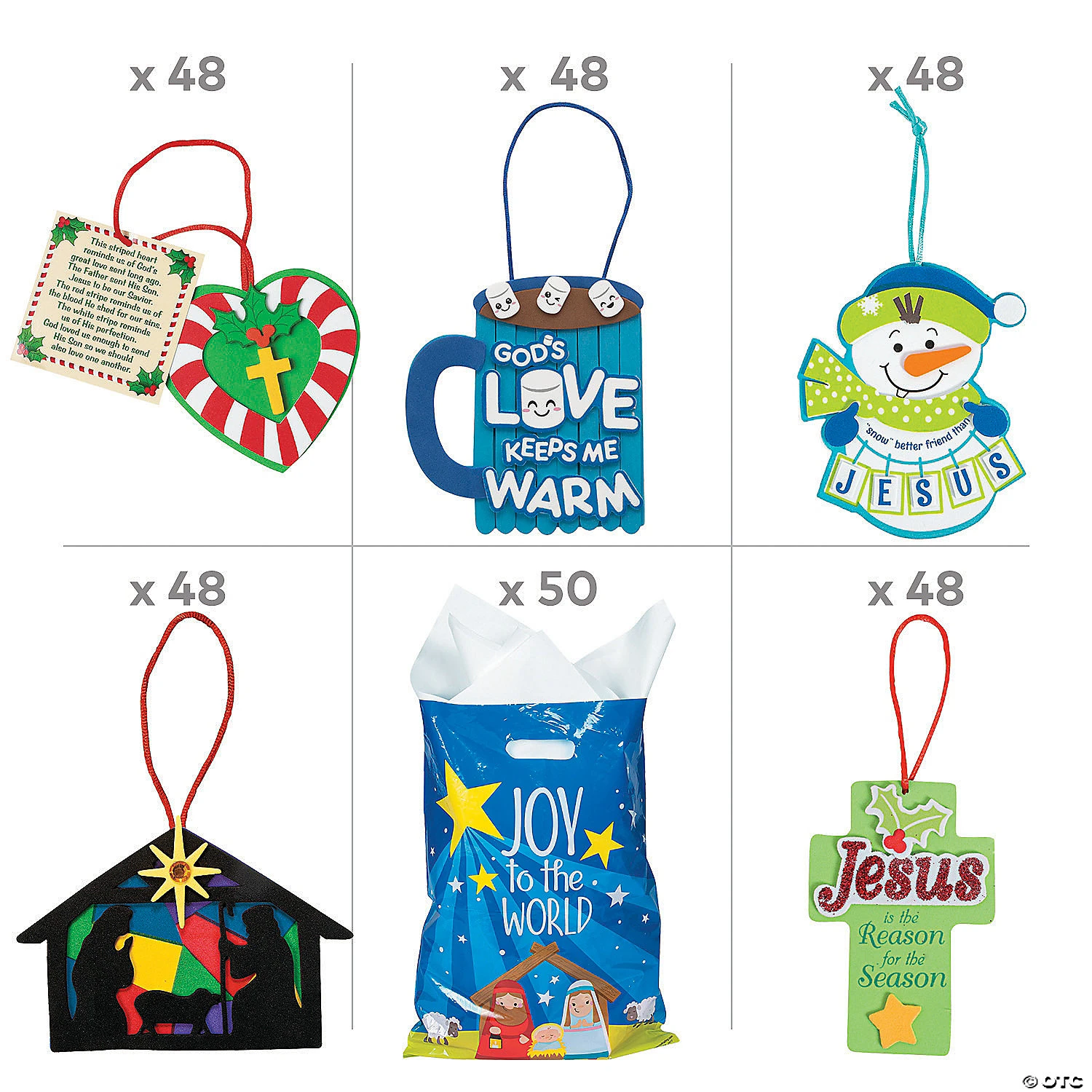 Share the reason for the season with your congregation, youth group or neighbors with these Nativity Ornament Craft Kits to-go! This kit includes bags and enough crafts for 48 kids to make 5 different ornaments for their tree! These Christmas crafts for kids are sure to bring a smile or two! A great idea for a socially distanced Christmas celebration. Includes 240 projects and 50 bags. All craft kit pieces are pre-packaged for individual use. Kits include instructions. Simple assembly required.Includes:β’ 48 Candy Cane Cross Ornament Craft Kits (All craft kit pieces are pre-packaged for individual use. Kits include instructions and extra pieces. 2″)β’Β 48 Godβs Love Keeps Me Warm Craft Kits (Includes self-adhesive foam pieces, wooden craft sticks and satin cording. 4 1/2″ x 4 3/4″)β’ 48 Religious Snowman Ornament Craft Kits (Includes self-adhesive foam pieces and satin cord. 4″ x 4 3/4″)β’ 48 Jesus Is the Reason Ornament Craft Kit (Includes self-adhesive foam and glittering foam pieces. 2 3/4″ x 4″)β’ 50 Plastic Large Nativity Goody Bags (12 1/2″ x 17″)β’ 48 Nativity Silhouette Christmas Ornament Craft Kits (Includes self-adhesive foam pieces. 5″ x 3 1/2″)β’ Assortments are subject to change at any time and may vary from picture shown. Substituted items will be similar in nature.