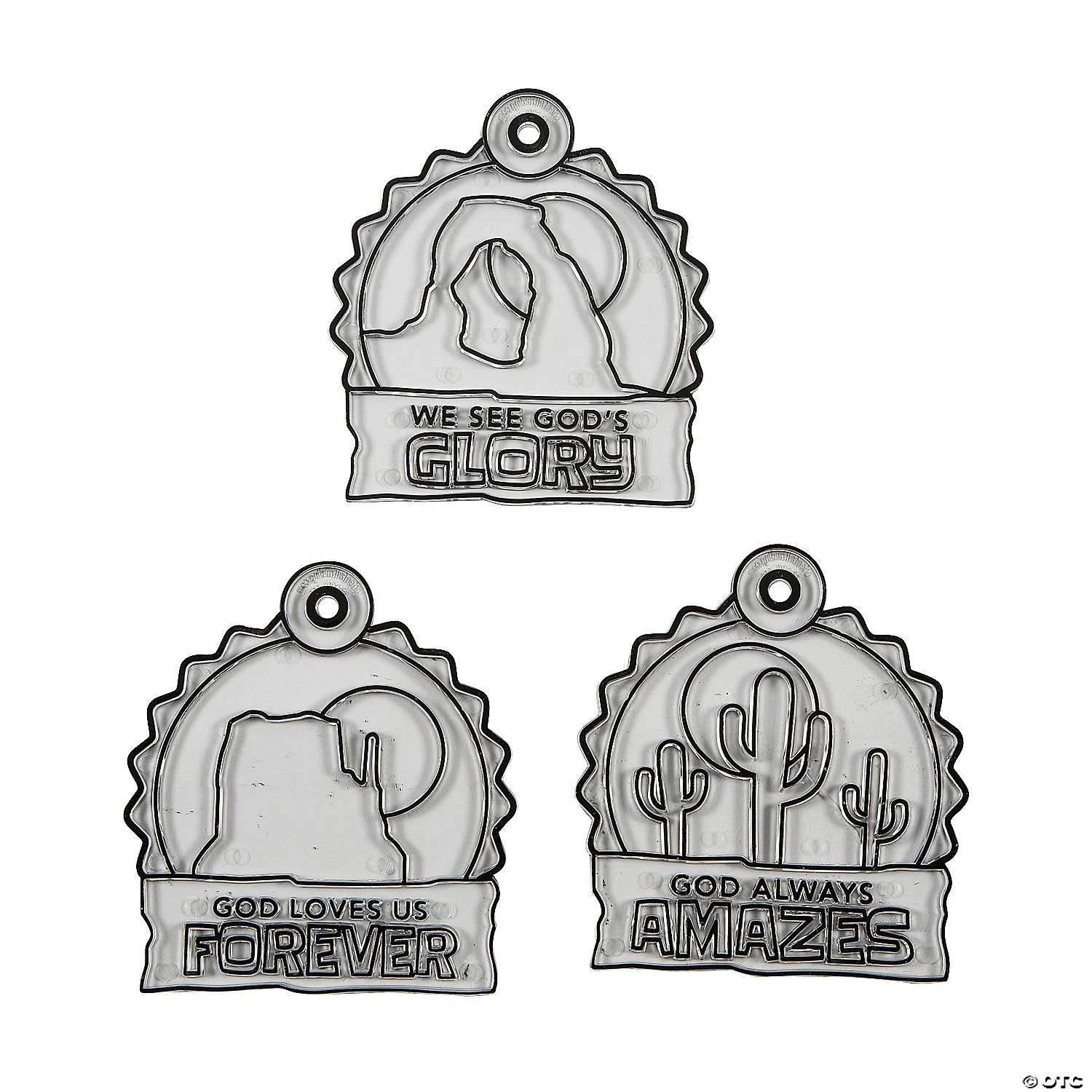 Help Southwest VBS kids celebrate Godβs glory with these fun suncatchers. Featuring Southwest VBS images and messaging, these suncatchers can be colored using suncatcher paint (sold separately on this website) and displayed to help kids remember the important lessons they learned during the VBS session. Plastic. (2 dozen per unit) 3 1/2″ x 4″ Suncatcher paint sold separately. Β© OTC