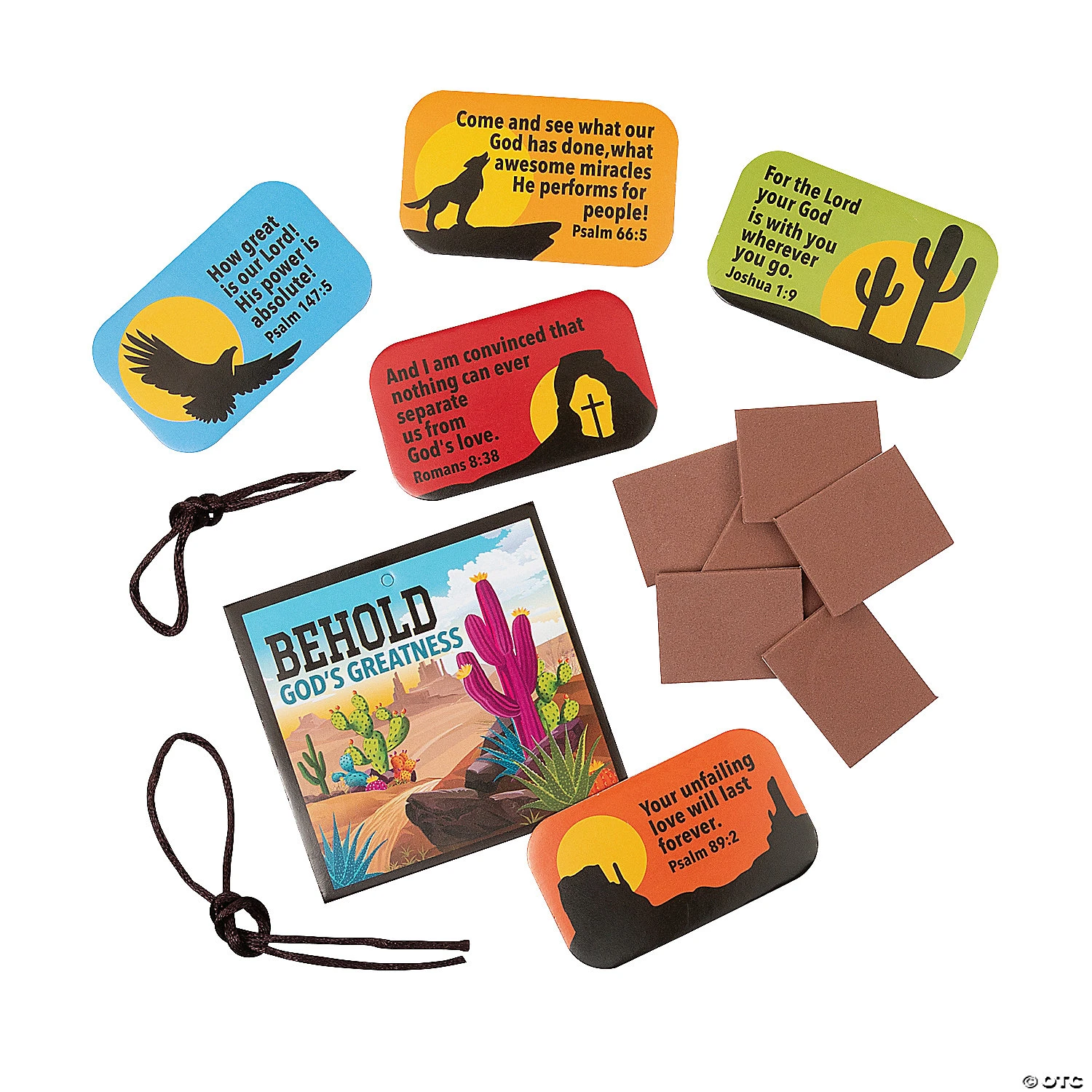 Help Southwest VBS kids commit verses to memory with the help of this fun craft kit! This simple peel-and-stick craft kit features Southwest VBS images along with a verse for each day of VBS. Each verse references the greatness of God and helps kids understand the importance of regarding God with reverence. Includes self-adhesive foam pieces and satin cording. 3″ x 11 1/2″Β All craft kit pieces are pre-packaged for individual use. Kits include instructions. Makes 12. Β© OTCSouthwest Verse a Day Instructions